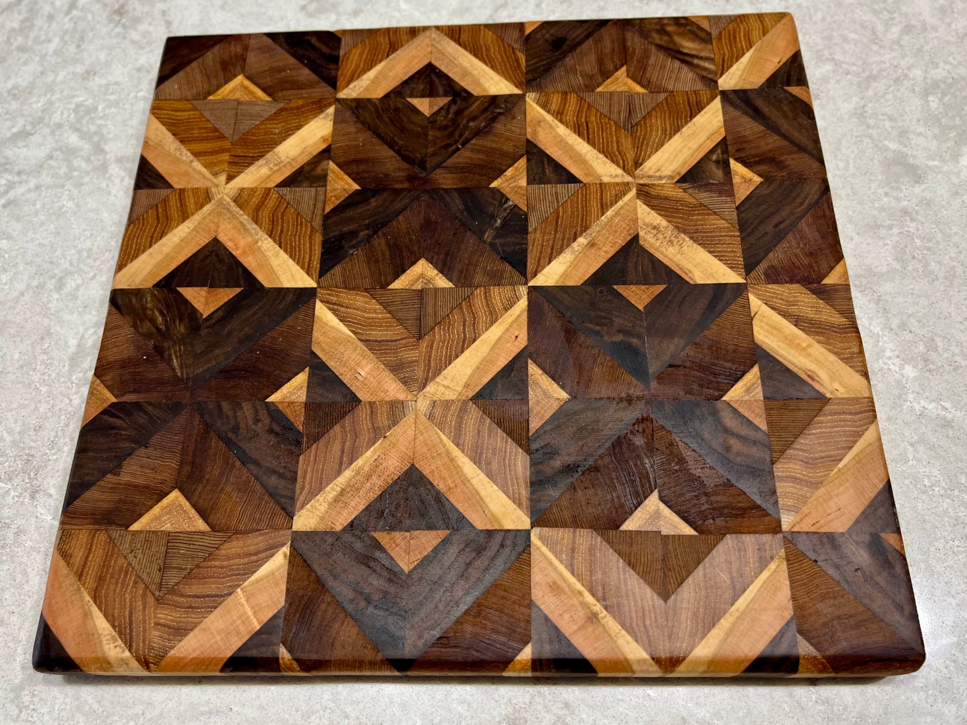 Handcrafted cutting board made from locally sourced walnut, oak, chestnut, and redwood. This beautiful board shows off an amazing interwoven pattern that is perfect for entertaining as a charcuterie board or prepping food. The edge grain will maintain durability and prevent dulling your knife blade.