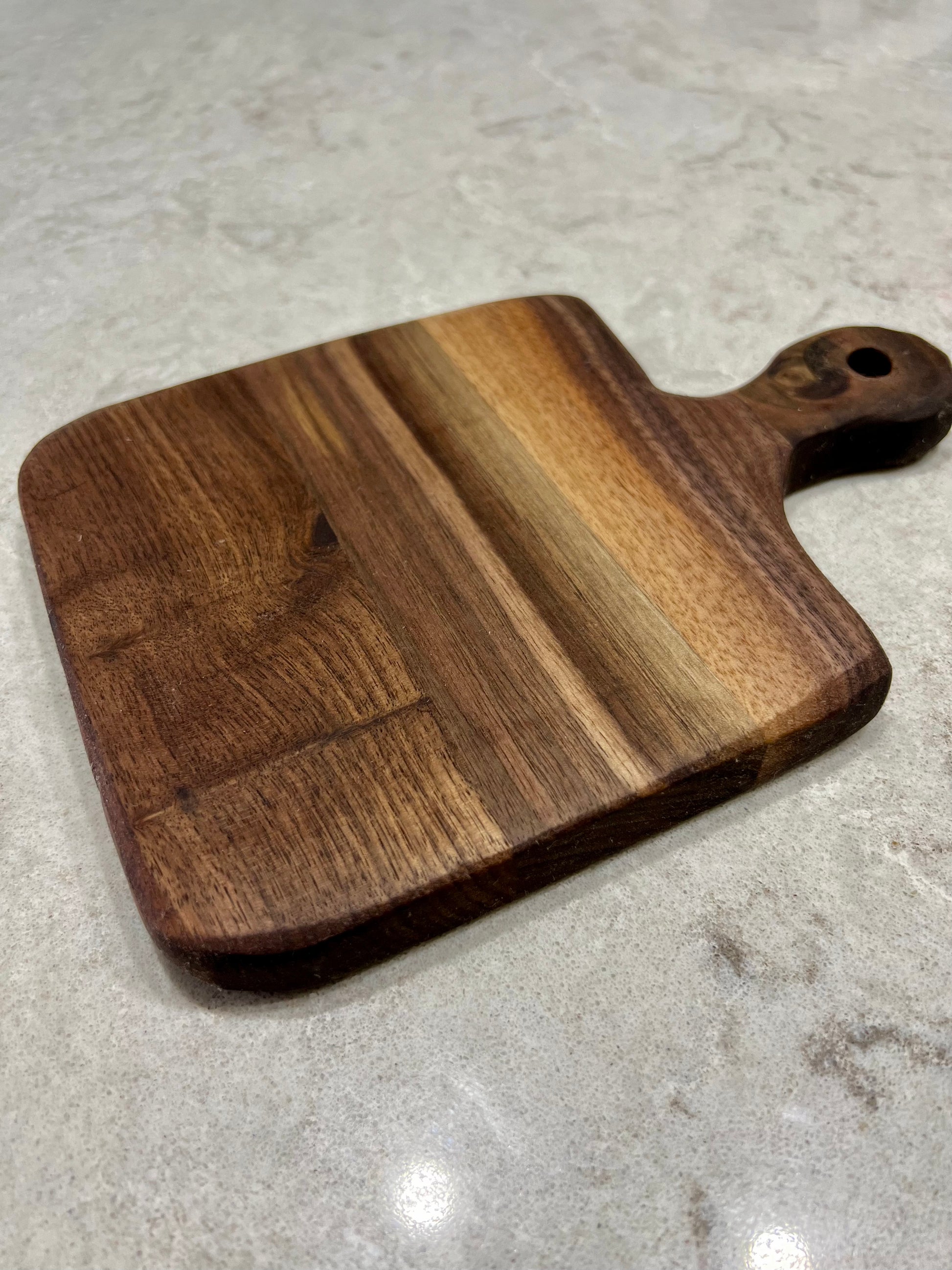 Beveled edge and handle for easier handling. Hole in the handle to hang. Thick and sturdy for handling any of your kitchen needs. Sanded smooth and finished with a homemade food grade mineral oil and beeswax mixture.