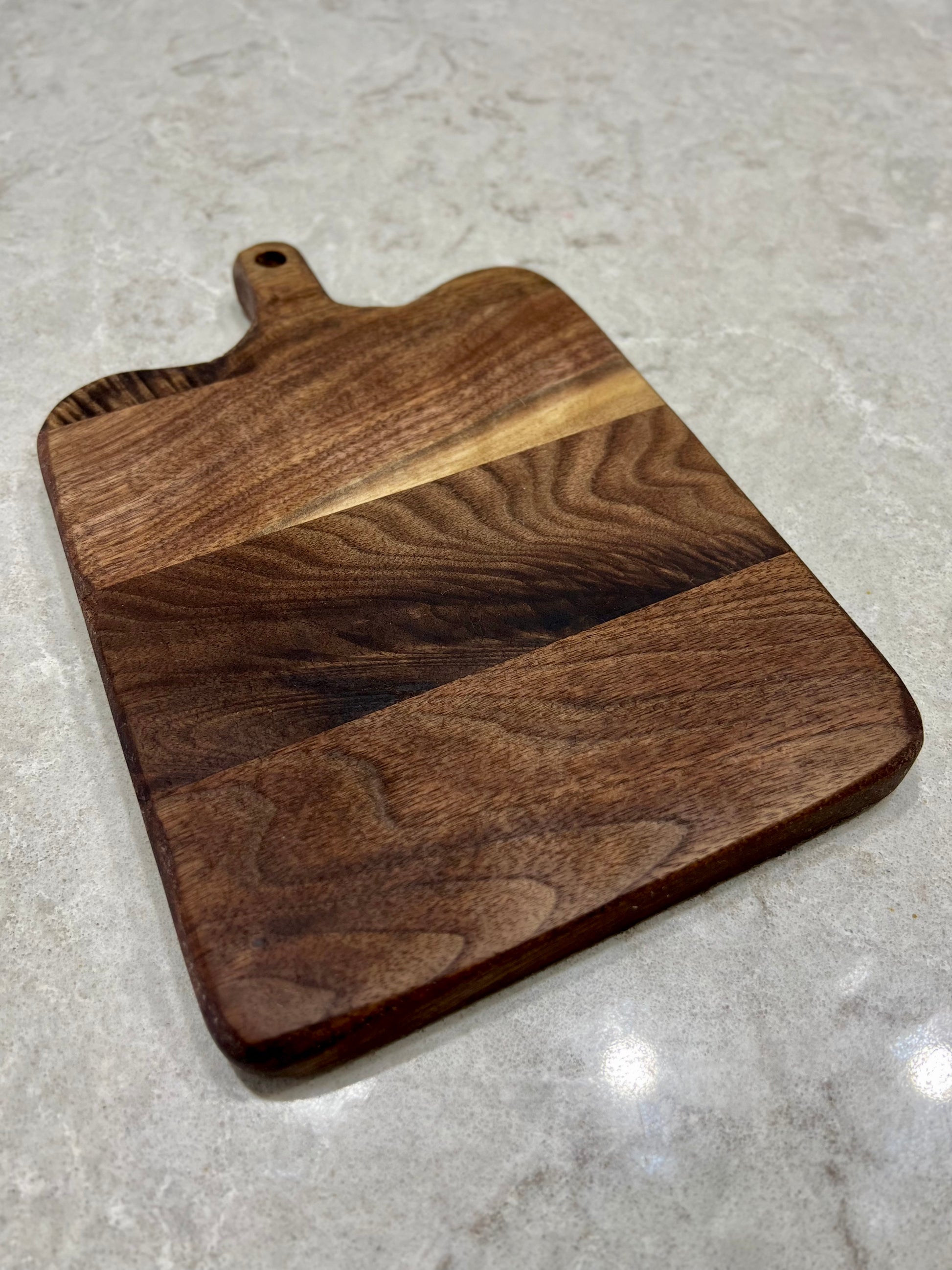 Handcrafted charcuterie board made from locally sourced walnut. This board is perfect for entertaining or prepping food. The beautiful walnut is showcased in the face grain of the board.