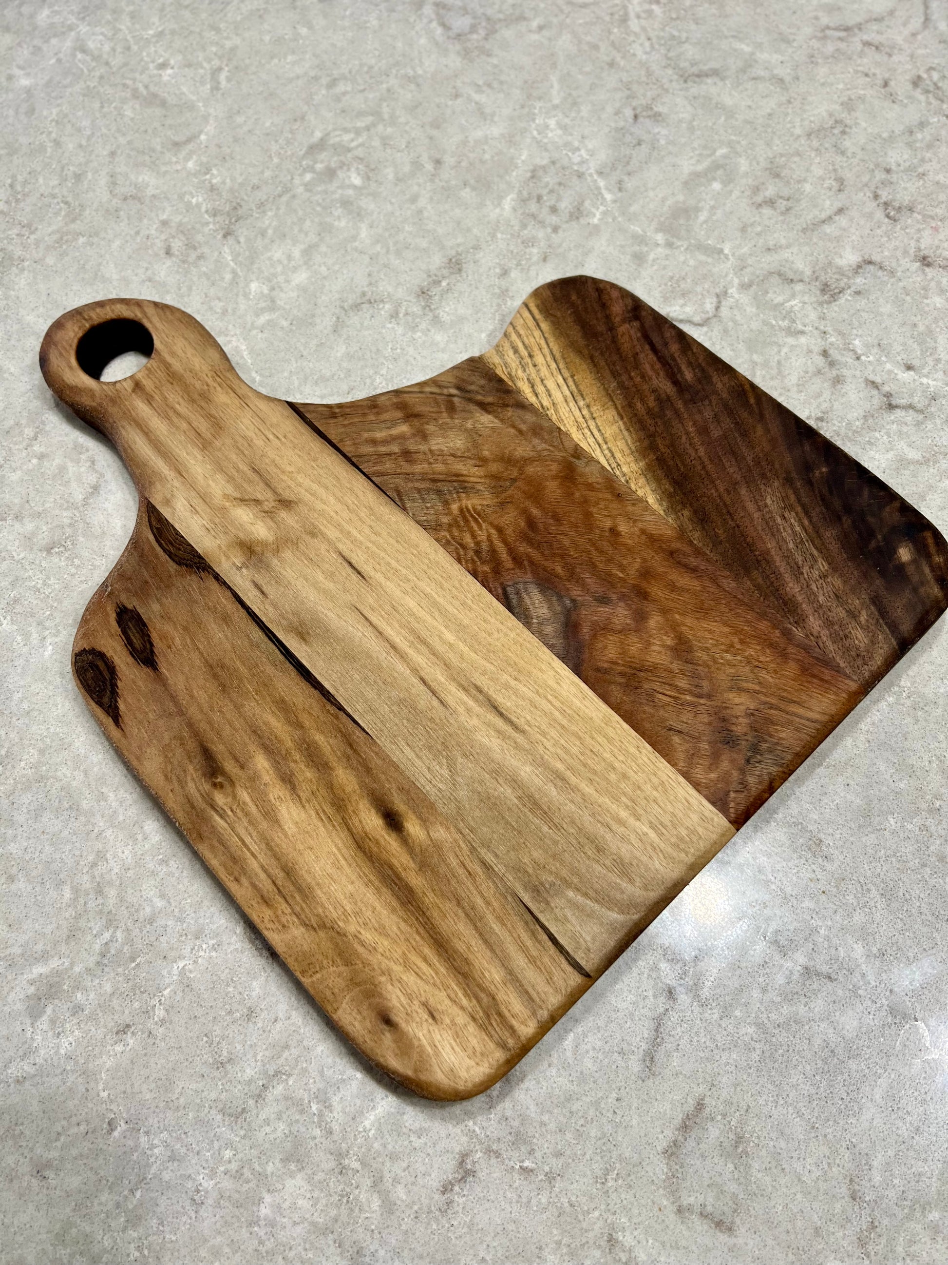 Beveled edge and handle for easier handling. Hole in the handle to hang. Thick and sturdy for handling any of your kitchen needs. Sanded smooth and finished with a homemade food grade mineral oil and beeswax mixture.