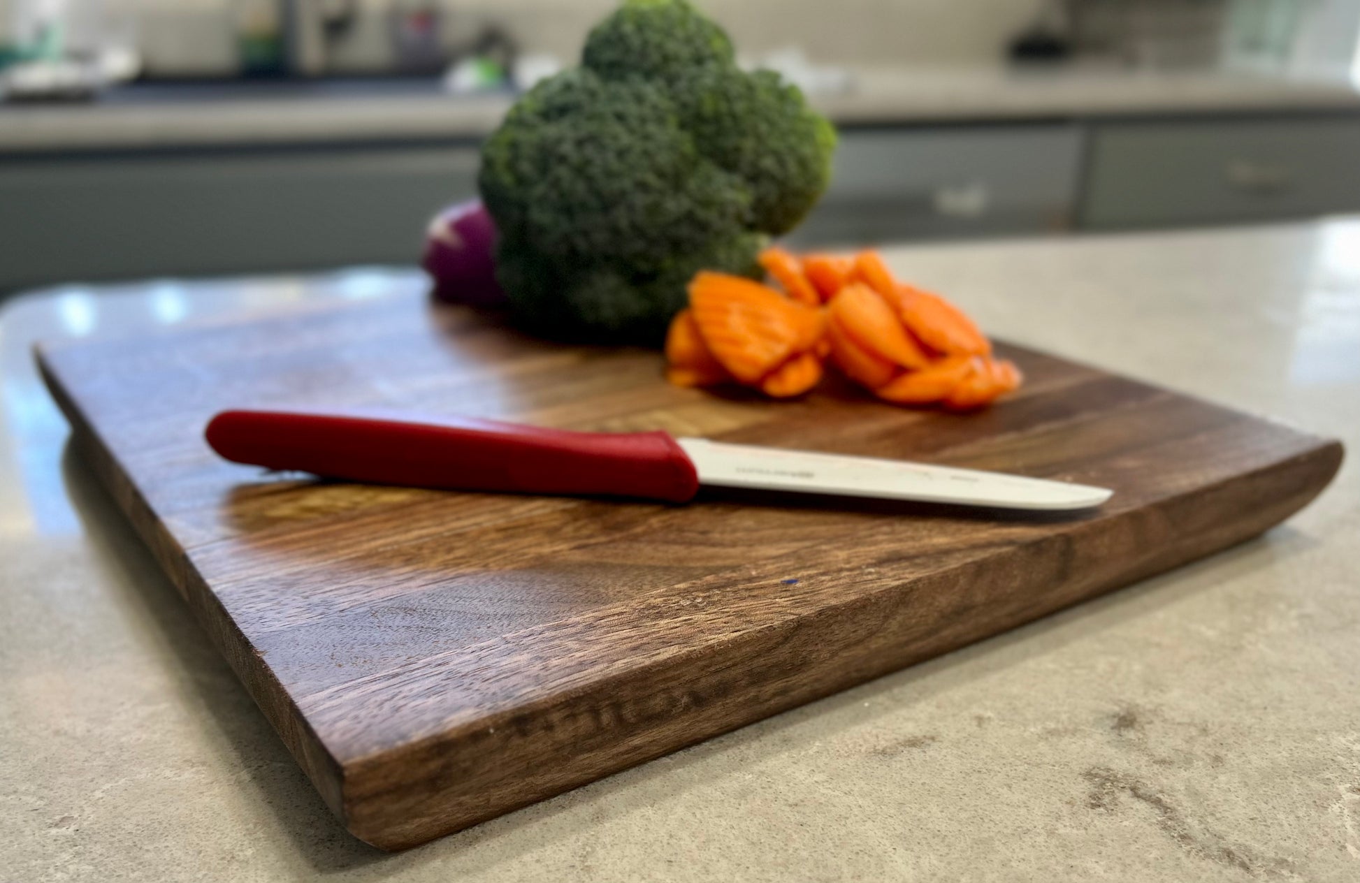 Beveled edge for easier handling. Perfect size for smaller food prep. Sanded smooth and finished with a homemade mineral oil and beeswax mixture.